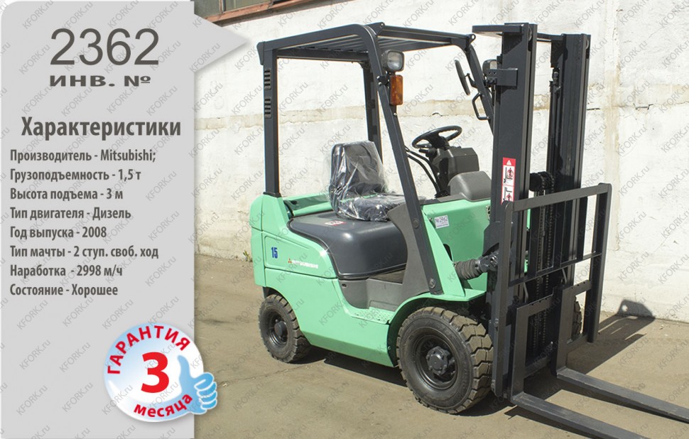 Дизельный автопогрузчик Mitsubishi Б/У с интентарным номером 2362 2008 года выпуска. Состояние - Хорошее. Имеет грузоподъемность 1500 кг. Гарантия: 3 мес или 500 м/час.
